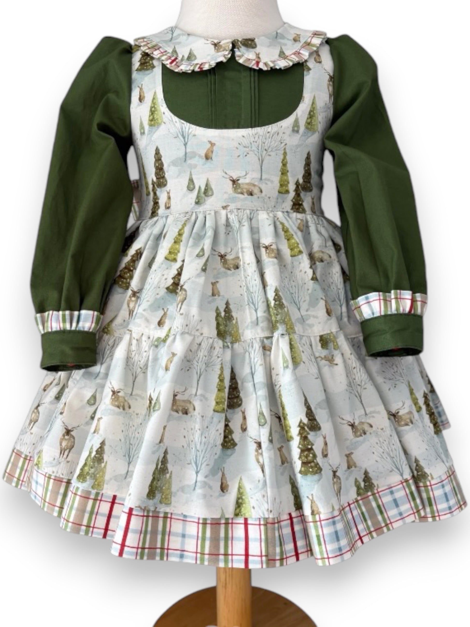 Dress your little one in festive charm with this handmade girls’ Christmas dress, crafted in the stunning Santa’s Tree Farm print. This boutique-style dress features a classic Peter Pan collar, plaid trim accents, and a statement hunter green contrasting solid with delicate pin tucks for a timeless holiday look.